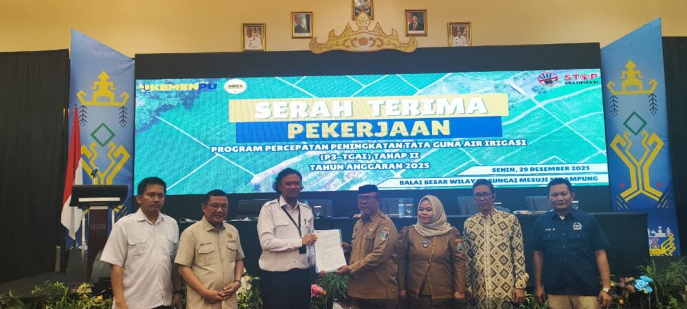 Bandar Lampung (Globalmediakencana)– Serah Terima Pekerjaan Program Percepatan Peningkatan Tata Guna Air Irigasi (P3-TGAI) Tatah II Tahun Anggaran 2025 yang diselenggarakan oleh Balai Besar Wilayah Mesuji Sekampung (BBWMS), di Ballroom Emersia Hotel, Senin (29/12/2025).