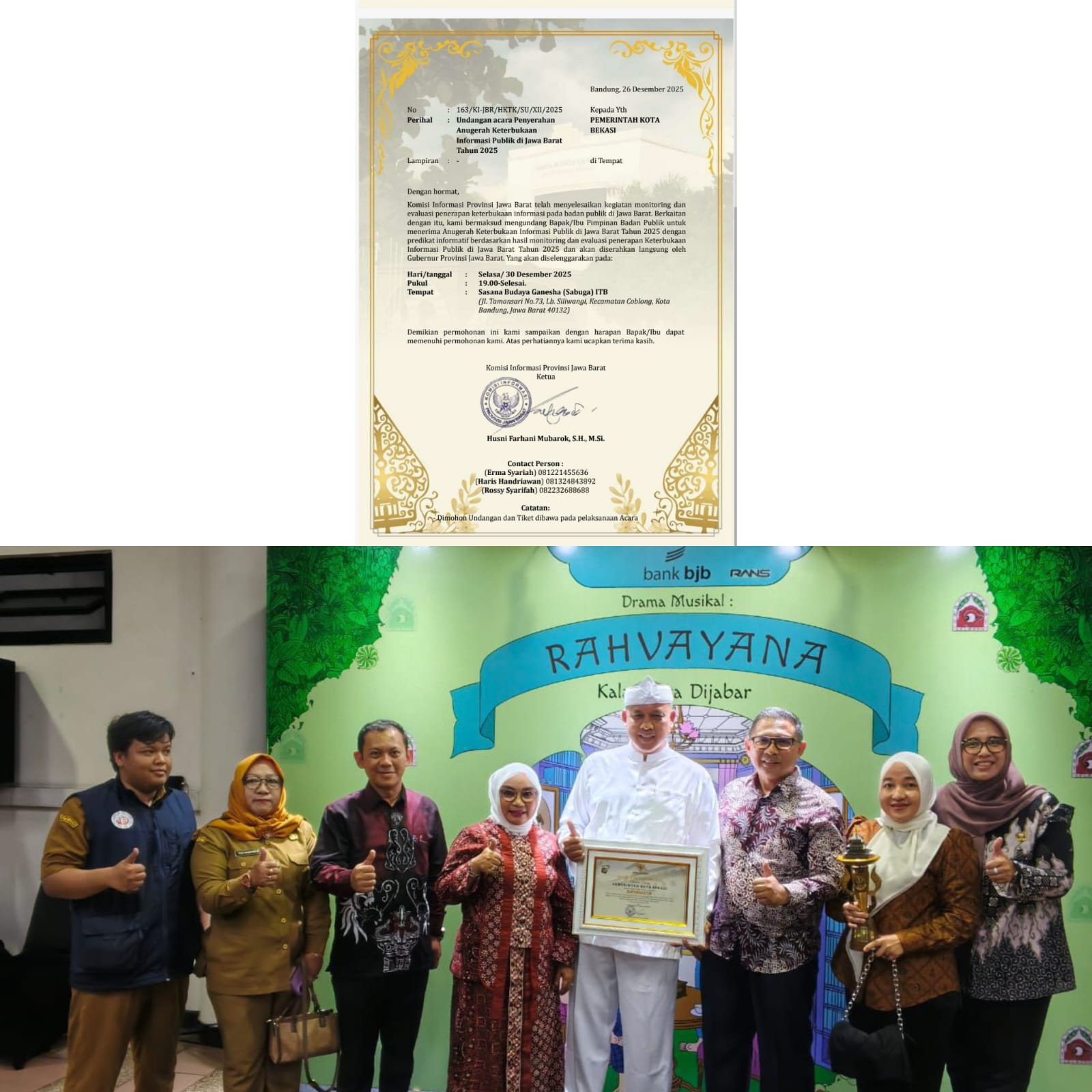 Penghargaan tersebut diserahkan langsung kepada Wali Kota Bekasi, Tri Adhianto didampingi oleh Istri Wiwiek Hargono Tri Adhianto dalam acara Penyerahan Anugerah Keterbukaan Informasi Publik di Jawa Barat Tahun 2025 yang berlangsung di Sasana Budaya Ganesha (Sabuga) ITB, Kota Bandung, Selasa malam (30/12/2025).